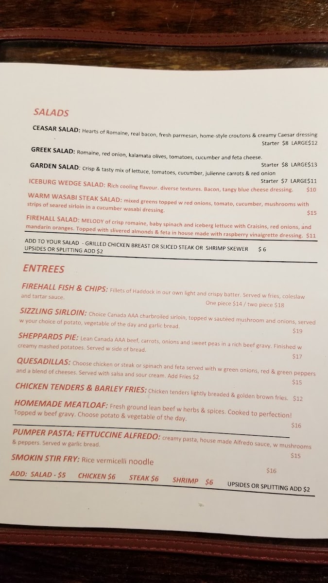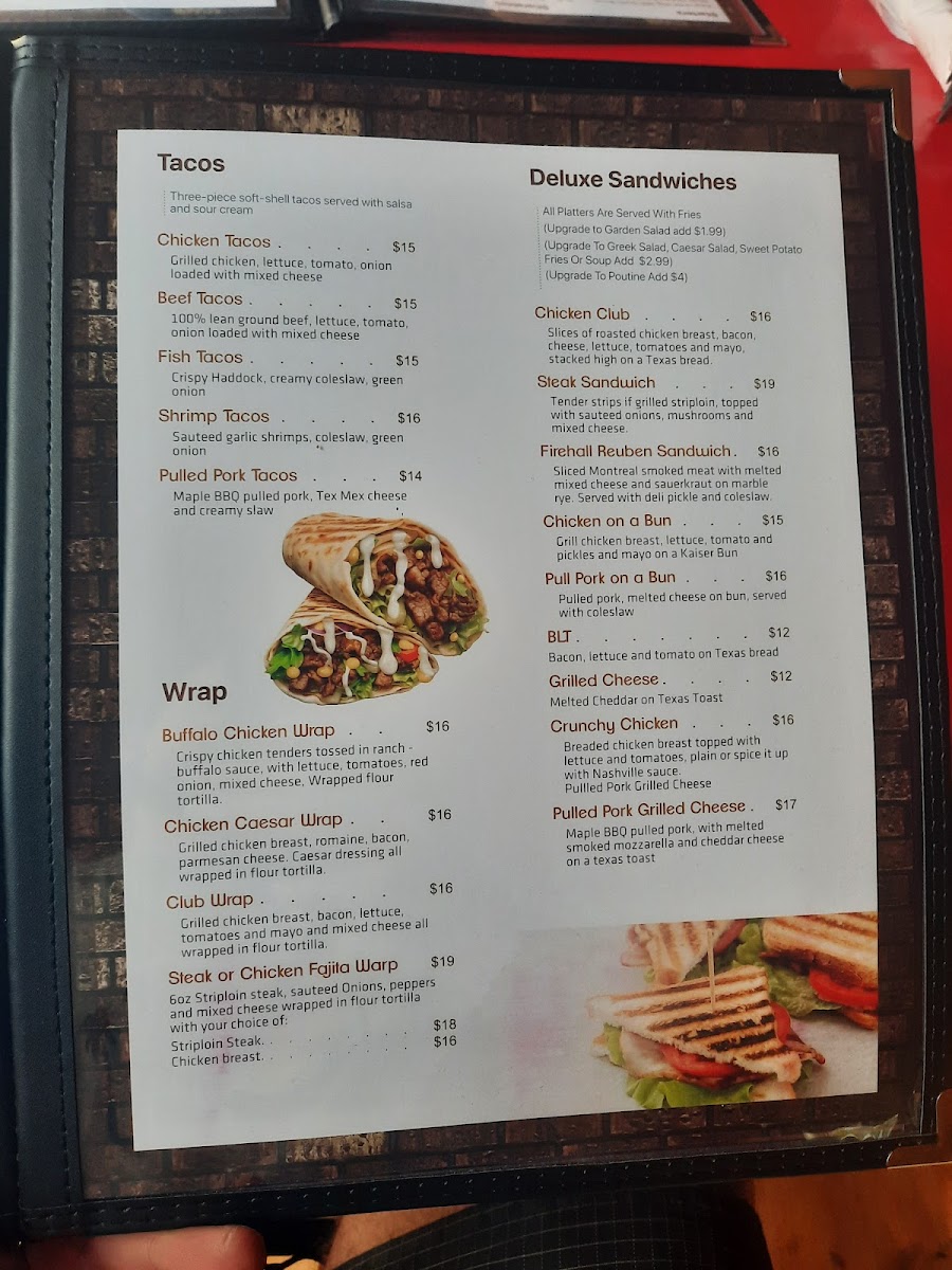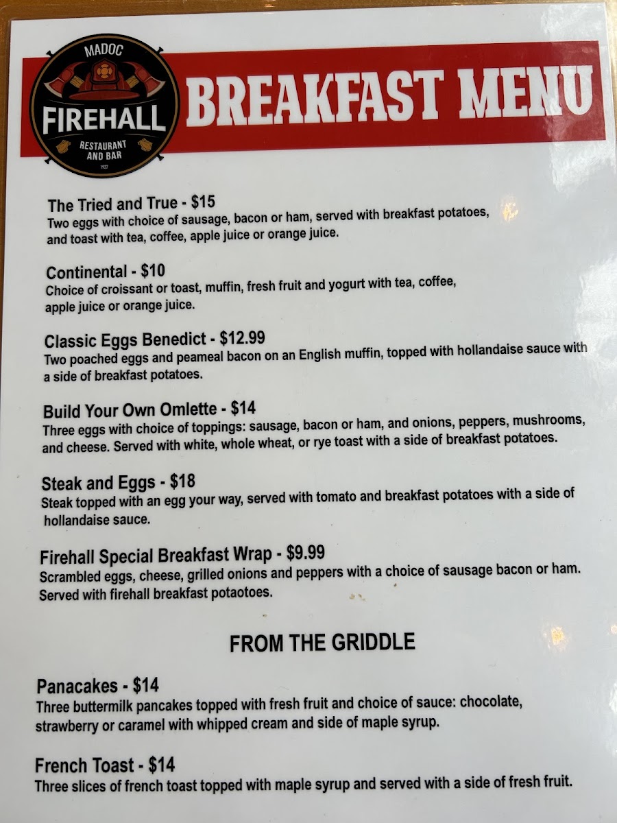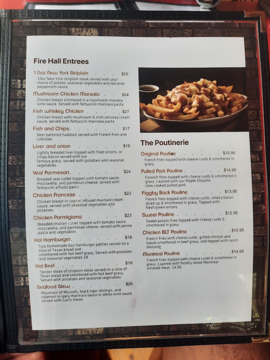Madoc Firehall Restaurant and Bar offers a diverse and satisfying menu with options for every taste. The salad selection includes classic choices like Caesar Salad and Greek Salad, as well as more unique offerings such as the Warm Wasabi Steak Salad. For hearty entrées, patrons can enjoy the signature Firehall Fish & Chips or opt for a Sizzling Sirloin or Shepherd's Pie. Comfort foods like Chicken Tenders & Barley Fries and Quesadillas also make an appearance. Sides include favorites like French Fries, Sweet Potato Fries, and Golden Onion Rings. The dessert menu features simple indulgences, such as Vanilla Ice Cream and a delicious Chocolate Brownie. For breakfast, there's a range of options from the Classic Eggs Benedict to customizable selections like the Build Your Own Omelette. The restaurant also excels in Firehall Entrees, offering dishes like the 10oz New York Striploin and Mushroom Chicken Marsala. A variety of poutines, such as the Pulled Pork Poutine and Sweet Poutine, can be found in the Poutinerie section, while the Firehall Burgers section includes everything from the Classic Burger to a Cracked Peppercorn Burger. Pasta lovers can dive into plates of Fettuccini Alfredo or Mac and Cheese, and there are also flavorful taco options like Pulled Pork Tacos and Fish Tacos. The Deluxe Sandwiches section features comforting choices like the Steak Sandwich and Firehall Reuben, and wraps such as the Buffalo Chicken Wrap provide a satisfying meal in a portable format. With its wide-ranging menu, the Madoc Firehall Restaurant and Bar is sure to cater to a variety of tastes and preferences.