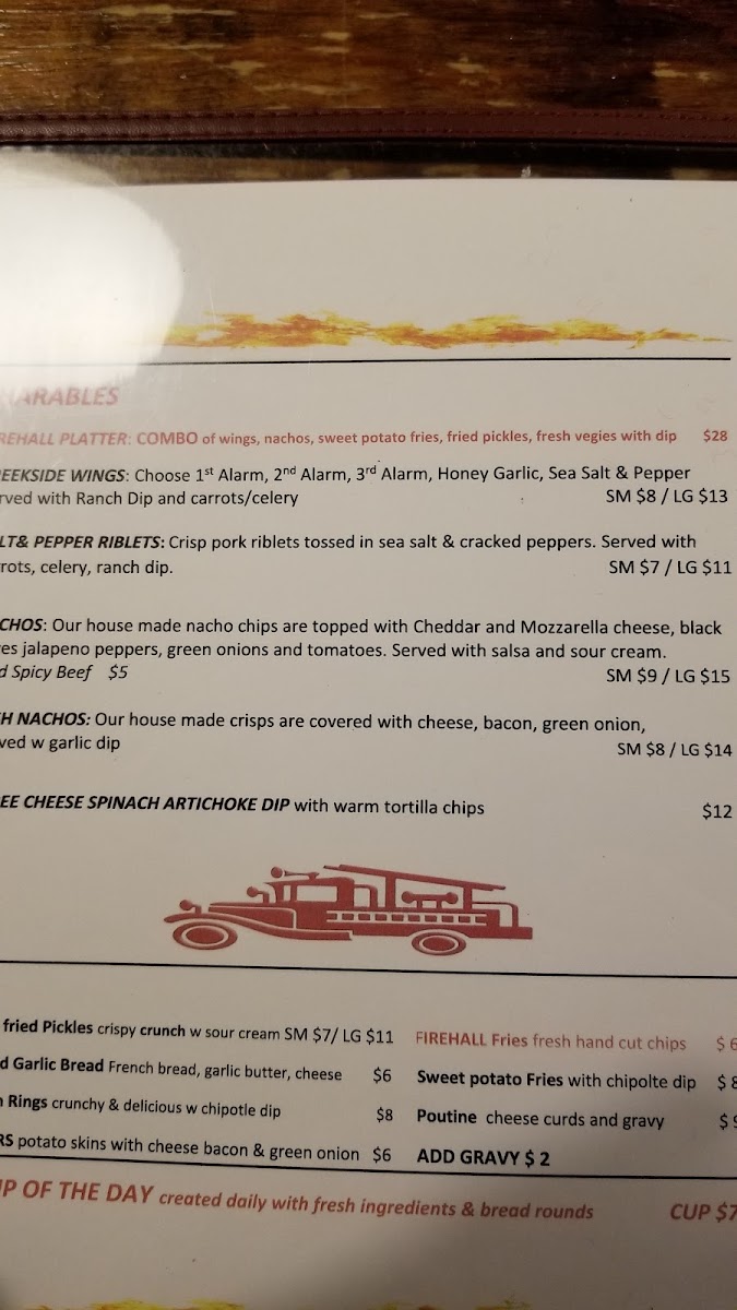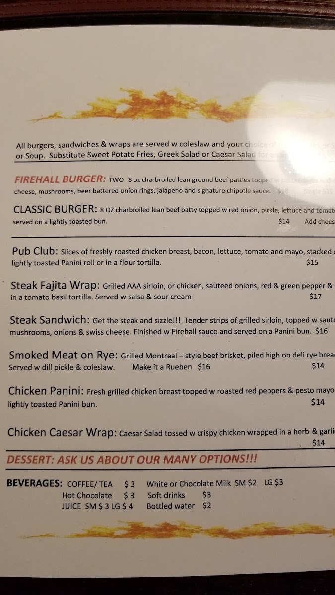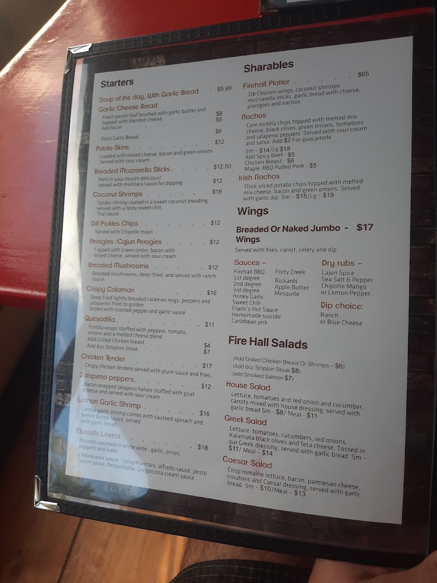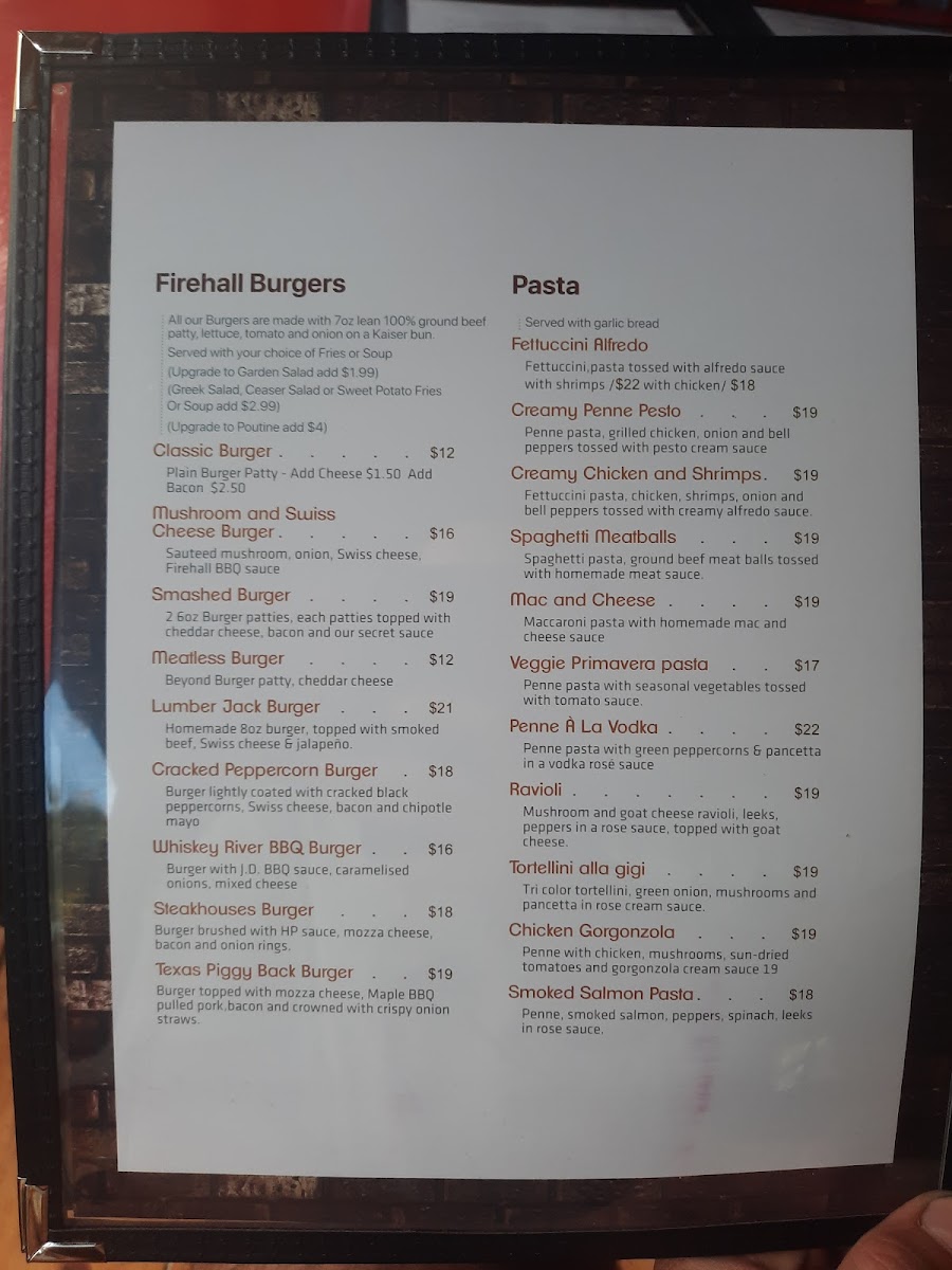 Madoc Firehall Restaurant and Bar offers a diverse and satisfying menu with options for every taste. The salad selection includes classic choices like Caesar Salad and Greek Salad, as well as more unique offerings such as the Warm Wasabi Steak Salad. For hearty entrées, patrons can enjoy the signature Firehall Fish & Chips or opt for a Sizzling Sirloin or Shepherd's Pie. Comfort foods like Chicken Tenders & Barley Fries and Quesadillas also make an appearance. Sides include favorites like French Fries, Sweet Potato Fries, and Golden Onion Rings. The dessert menu features simple indulgences, such as Vanilla Ice Cream and a delicious Chocolate Brownie. For breakfast, there's a range of options from the Classic Eggs Benedict to customizable selections like the Build Your Own Omelette. The restaurant also excels in Firehall Entrees, offering dishes like the 10oz New York Striploin and Mushroom Chicken Marsala. A variety of poutines, such as the Pulled Pork Poutine and Sweet Poutine, can be found in the Poutinerie section, while the Firehall Burgers section includes everything from the Classic Burger to a Cracked Peppercorn Burger. Pasta lovers can dive into plates of Fettuccini Alfredo or Mac and Cheese, and there are also flavorful taco options like Pulled Pork Tacos and Fish Tacos. The Deluxe Sandwiches section features comforting choices like the Steak Sandwich and Firehall Reuben, and wraps such as the Buffalo Chicken Wrap provide a satisfying meal in a portable format. With its wide-ranging menu, the Madoc Firehall Restaurant and Bar is sure to cater to a variety of tastes and preferences.